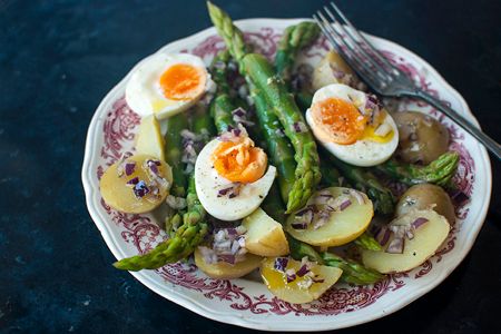 - Spread Bechamel over the dough and top with asparagus (if necessary, cut off the bottom forth of asparagus and shave them).