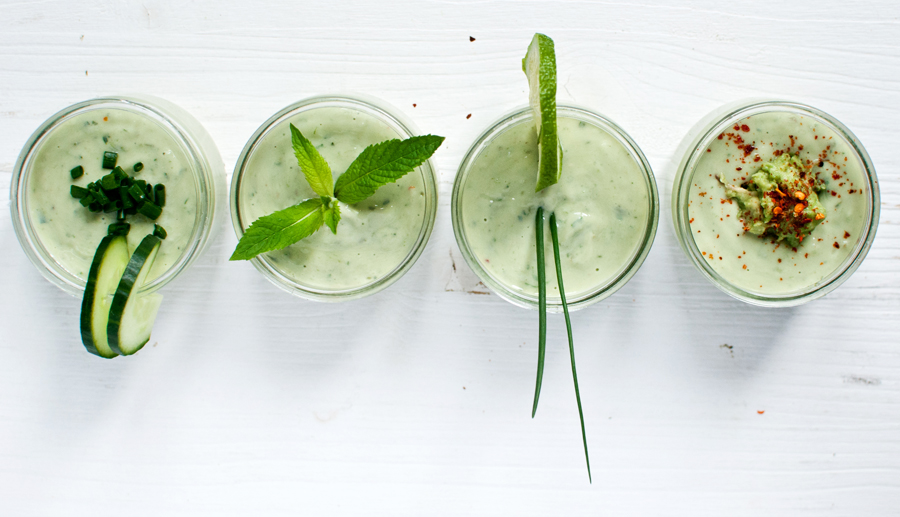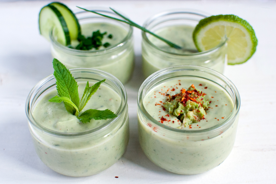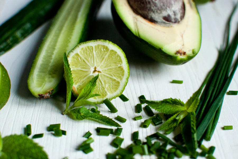 • Combine all the ingredients using a blender. Refrigerate for about an hour. Serve with chopped chives, fresh mint, avocado pulp and dried chili flakes.