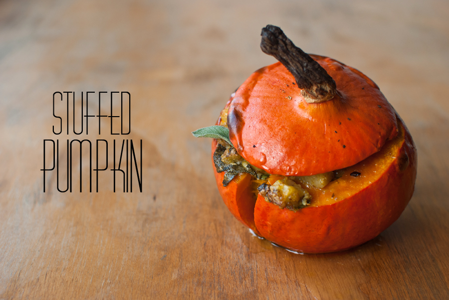 • Cut a cap out of the top of the pumpkin and remove the seeds. Place on a baking sheet (lined with some parchment paper), drizzle with olive oil, sprinkle with salt and pepper. Bake at 180C for 20 minutes. Dice the shallots and saute them on butter. Add curry powder and fry for 2-3 minutes. Add diced potatoes and chopped sage. Season with salt and pepper. Fry for 10-15 minutes, until the potatoes soften. Place the stuffing inside the pumpkin. Bake at 180C for 20-25 minutes.