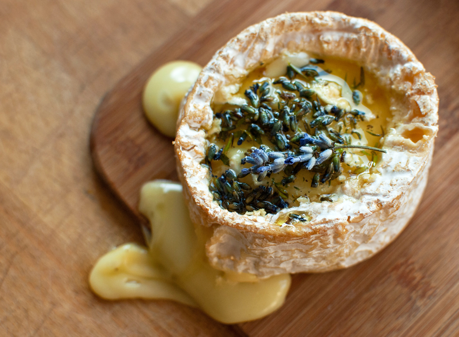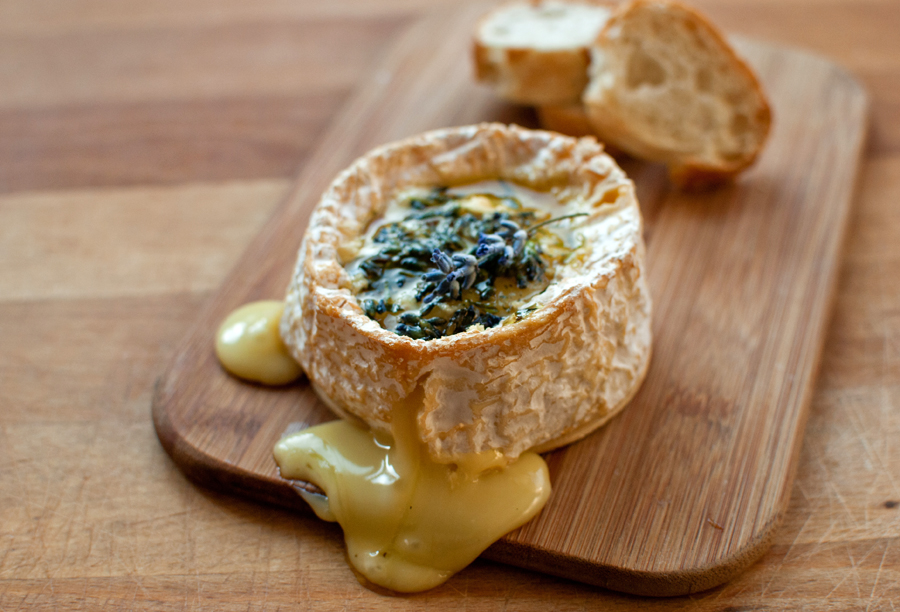 Combine honey with olive oil and herbs. Cut rind about 5-10 mm from the edge. Pour honey mix on the cheese. Bake at 180C for 10-12 minutes. Serve with fresh baguette.